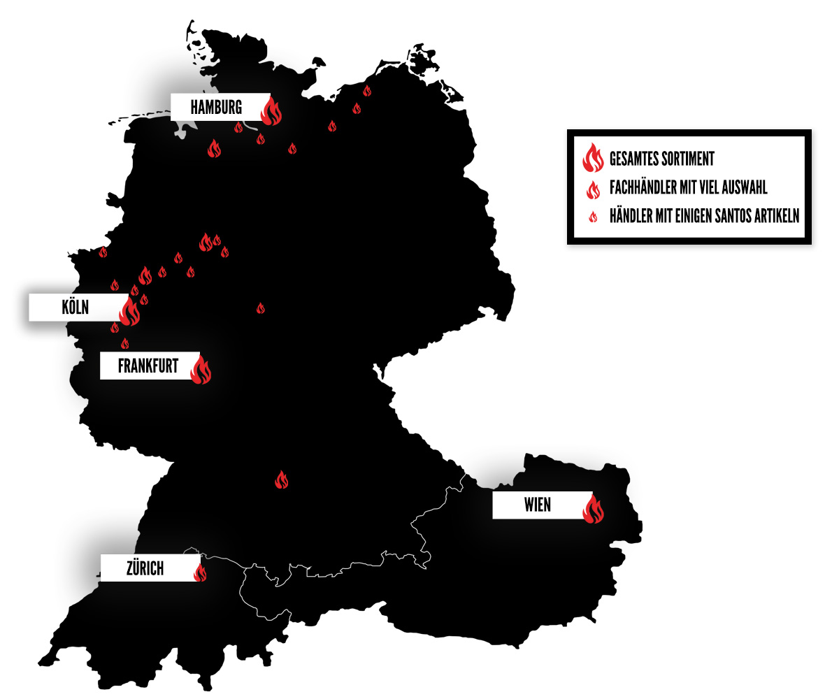 Erlebe die Welt des Grillens an fünf einzigartigen SANTOS Standorten! In Köln, Hamburg, Frankfurt, Wien und Zürich erwartet Dich ein riesiger Grillshop mit einer beeindruckenden Auswahl an Grills aller namhaften Hersteller sowie passendem Zubehör.