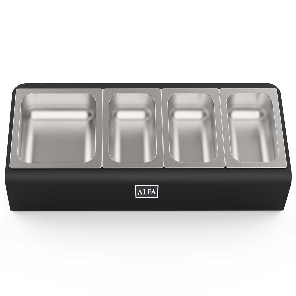 Mit der Topping Station von Alfa Forni macht das Pizzabacken noch mehr Spaß. Tomatensauce, Pilze, Schinken, Käse – in Eurer professionellen Pizzaküche habt Ihr alle Zutaten griffbereit und perfekt organisiert in direkter Reichweite, wo Ihr sie braucht. Die vier herausnehmbaren Schalen bestehen aus lebensmittelechtem Edelstahl und sind spülmaschinenfest. Mit den praktischen Deckeln könnt Ihr Eure Zutaten abdecken, falls Ihr gerade eine Pizza-Pause einlegt oder die Zutaten hygienisch im Kühlschrank lagern möchtet. Die robuste Halterung aus pulverbeschichtetem Stahl gefällt durch Ihr schlichtes und funktionelles Design, welches perfekt mit den Alfa Forni Pizzaöfen harmoniert. Gummipads an der Unterseite verhindern Kratzer auf der Stellfläche und an der Halterung.Die Highlights der Alfa Forni Toppingstation
