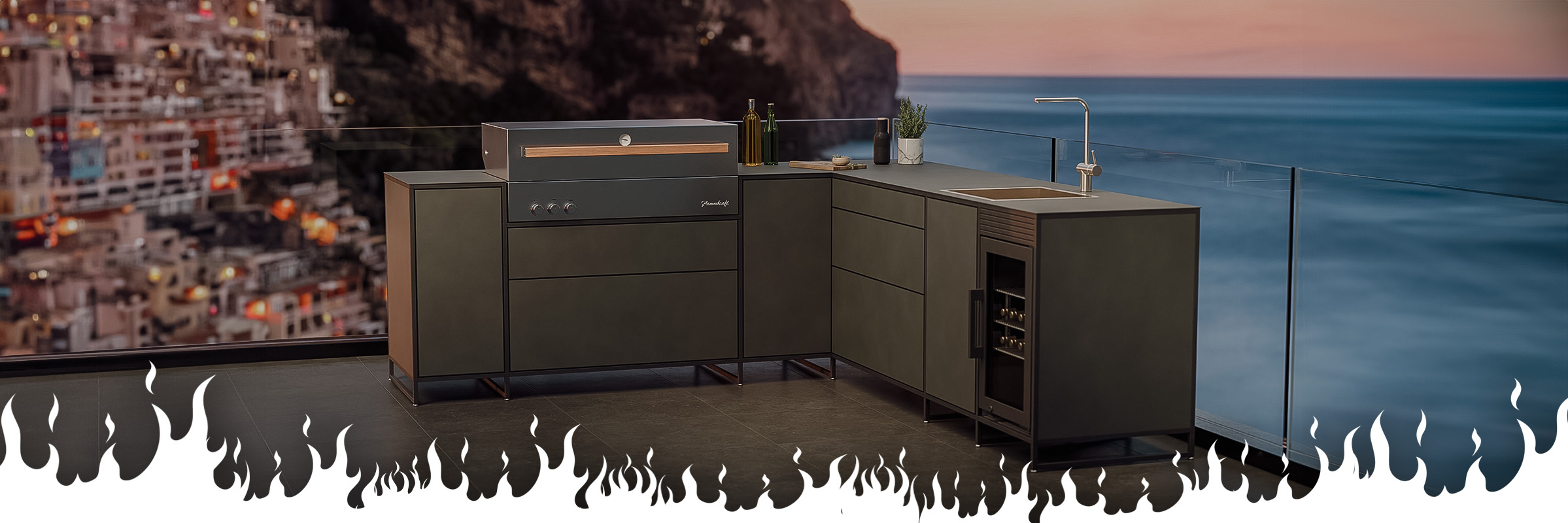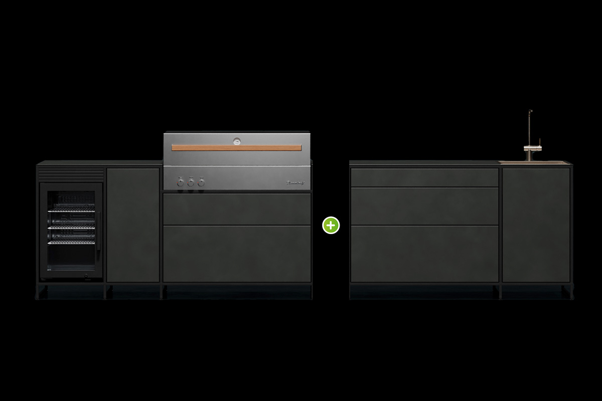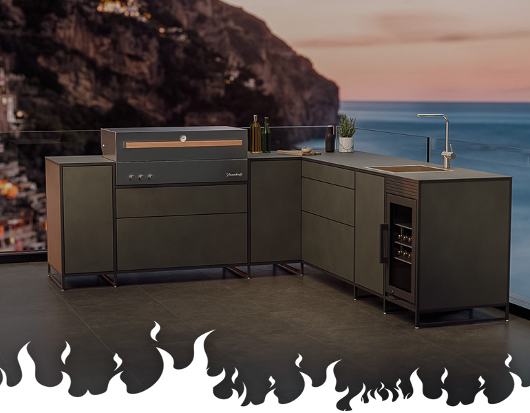 Genießt ein elegantes und herausragendes Design mit unseren Outdoorküchen, deren schlanke Seitenwände ein optisches Highlight bilden und sich deutlich von herkömmlichen Modellen abheben. Gestaltet Eure Küche ganz nach Eurem Geschmack mit einer breiten Auswahl an Materialien wie Keramik und gepulvertem Aluminium, verfügbar in unterschiedlichen Farben.