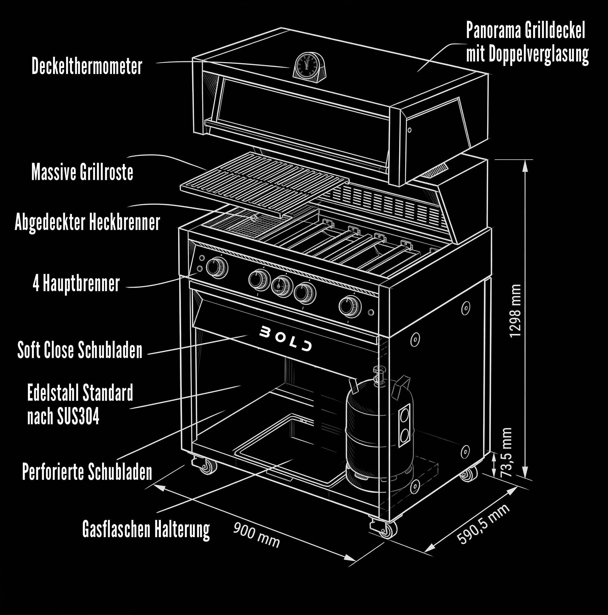 Die SANTOS BOLD Außenküche setzt neue Maßstäbe – vom ersten Moment an. Bereits beim Auspacken spürt Ihr den Unterschied: nahezu komplett vormontiert, kompromisslos hochwertig und bereit für den Einsatz. Jedes Modul ein eigenständiges Design-Statement, gefertigt aus massivem SUS304 Edelstahl – präzise, langlebig, „Built to Last“. Der Panorama-Grilldeckel mit Doppelverglasung, federgedämpfter Mechanik und durchdachten Details wie Fiberglas-Puffern zeigt: Hier trifft Ingenieurskunst auf echtes BBQ-Erlebnis.