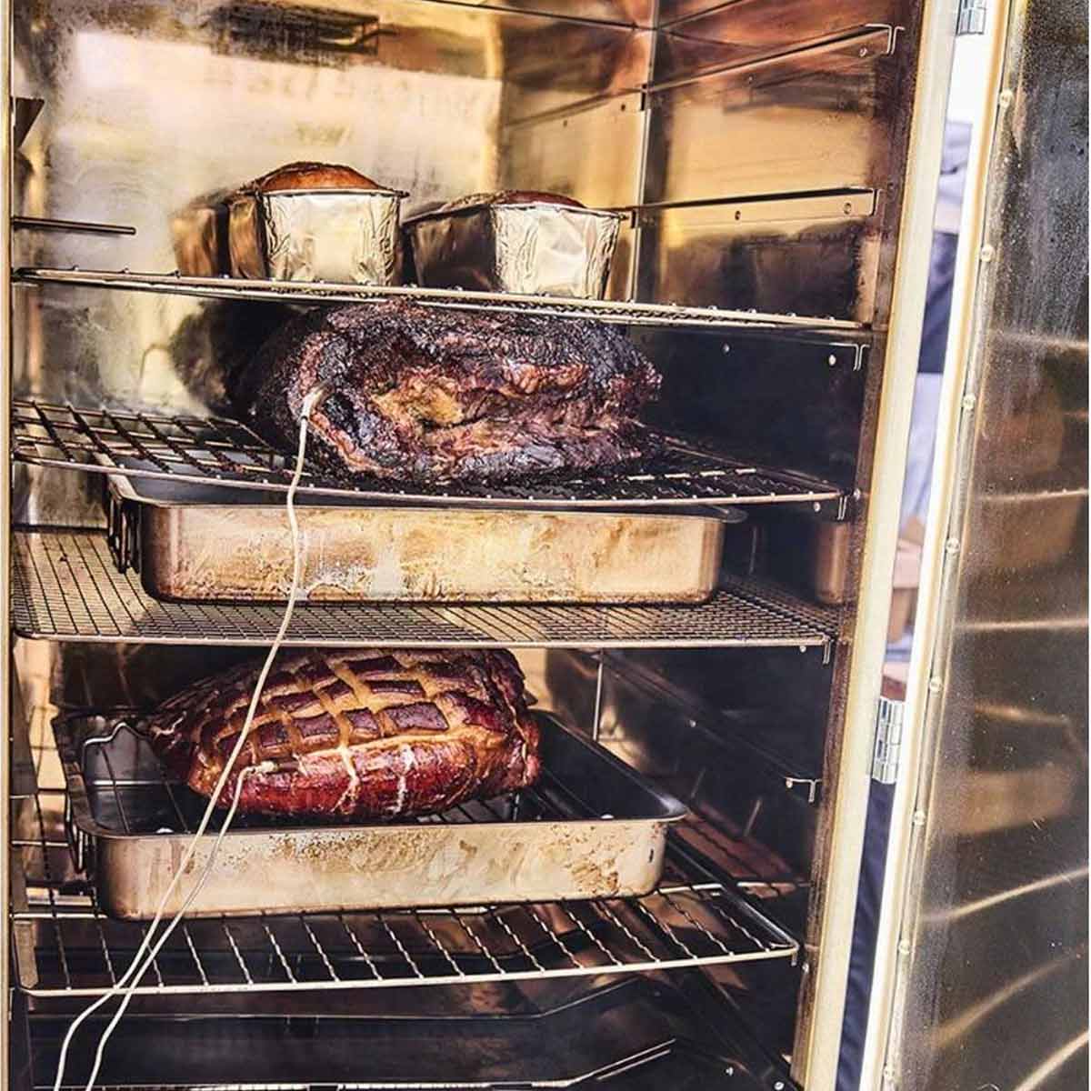 Der Temperaturbereich bis 120 °C erlaubt vielseitige Anwendungen: Ihr könnt Kalt- und Heißräuchern, Trocknen, Dörren oder Speisen einfach warmhalten. Zwei präzise Kerntemperatursonden garantieren dabei perfekte Ergebnisse – saftig, gleichmäßig gegart und mit vollem Rauchgeschmack.