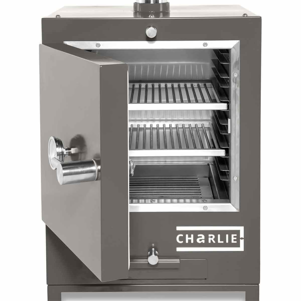 - Kompakter Holzkohleofen mit sechs verstellbaren Gar-Ebenen