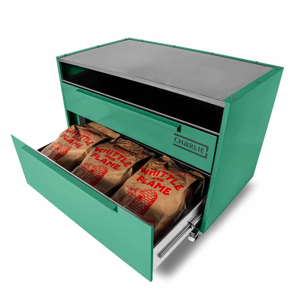 Mit seiner eleganten pulverbeschichteten Außenhülle in den typischen Charlie-Farben lässt er sich perfekt mit allen Charlie Oven Modellen kombinieren – ob Classic, Professional oder Cheeky Charlie.