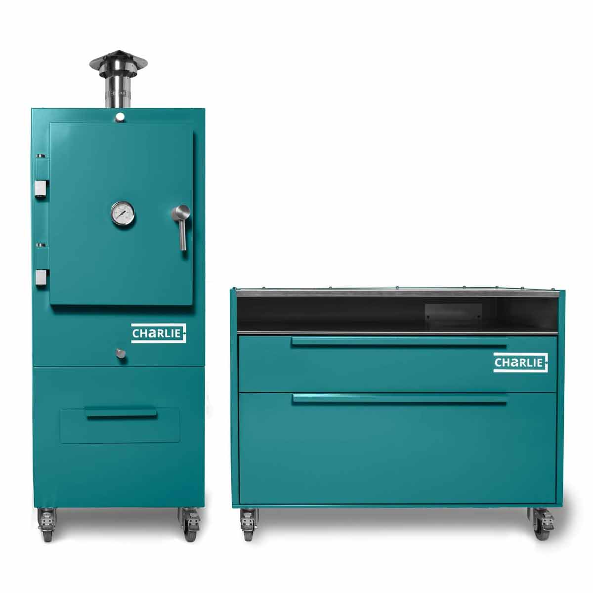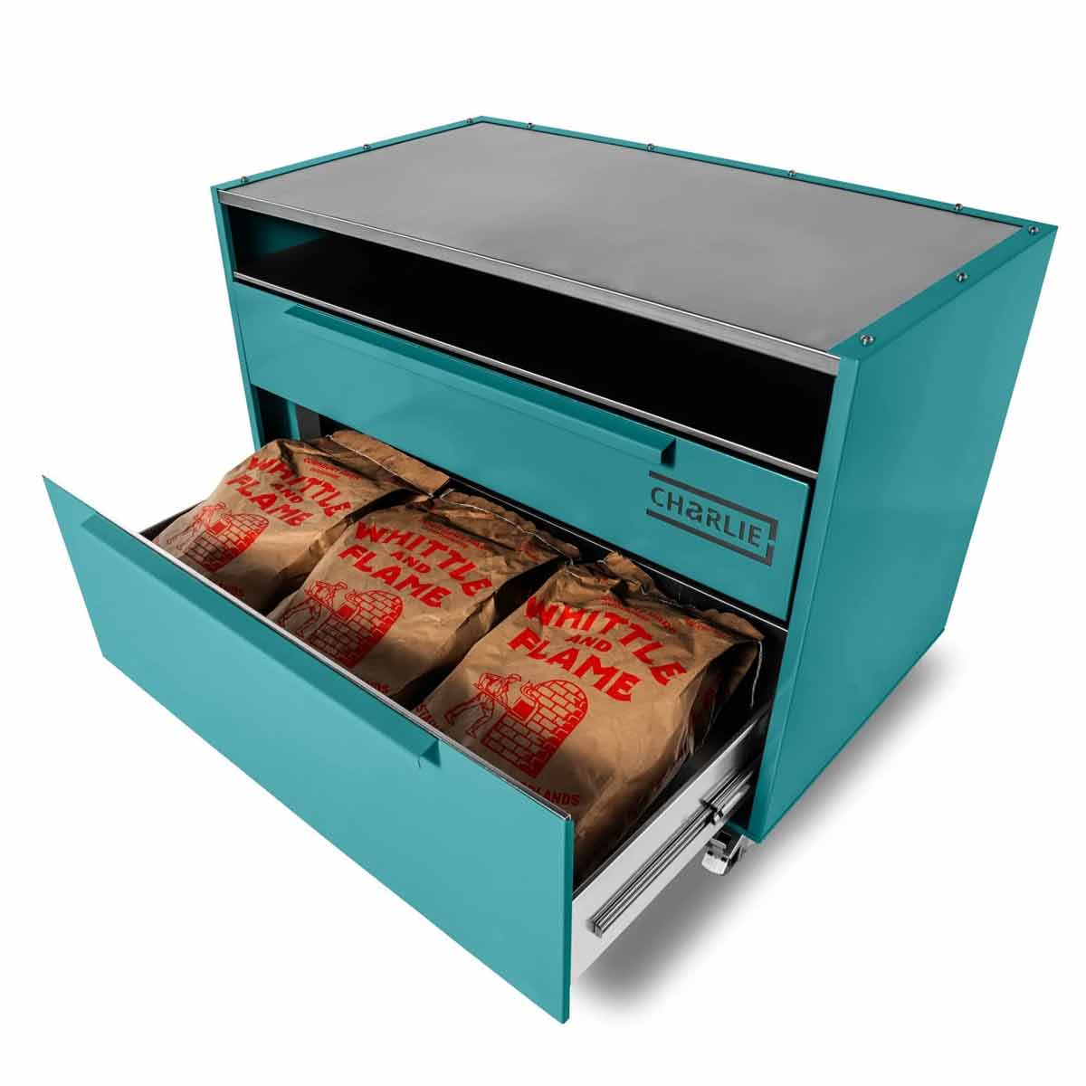 Mit seiner eleganten pulverbeschichteten Außenhülle in den typischen Charlie-Farben lässt er sich perfekt mit allen Charlie Oven Modellen kombinieren – ob Classic, Professional oder Cheeky Charlie.
