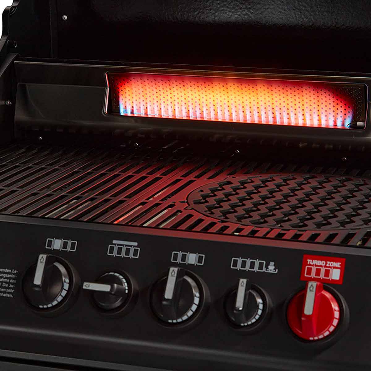 Außerdem könnt Ihr auf der 800°C Turbo Zone Eurem Grillgut mit ordentlich Röstaromen Feuer machen. Hier sorgt ein frei regulierbarer 4,2 kW-Brenner für Extra-Power, das spezielle Mesh-Gewebe der Brennerabdeckung heizt zusätzlich mit Infrarot-Hitze ein. Wer auf Spießgerichte und krosse Pizza steht, wird sich über die zusätzliche Heckbrenner-Power freuen, die mit 3,5 kW für krosse Grillergebnisse sorgt. Und da auch Beilagen beim BBQ-Menü eine wichtige Rolle spielen, rundet ein Seitenkochfeld die Ausstattung perfekt ab.