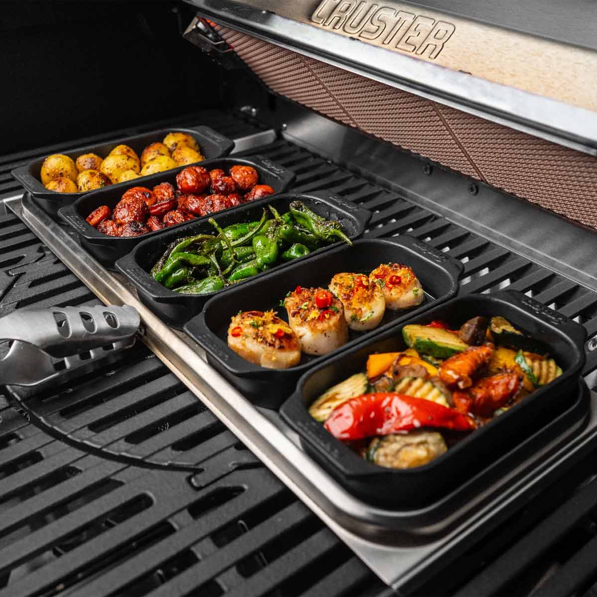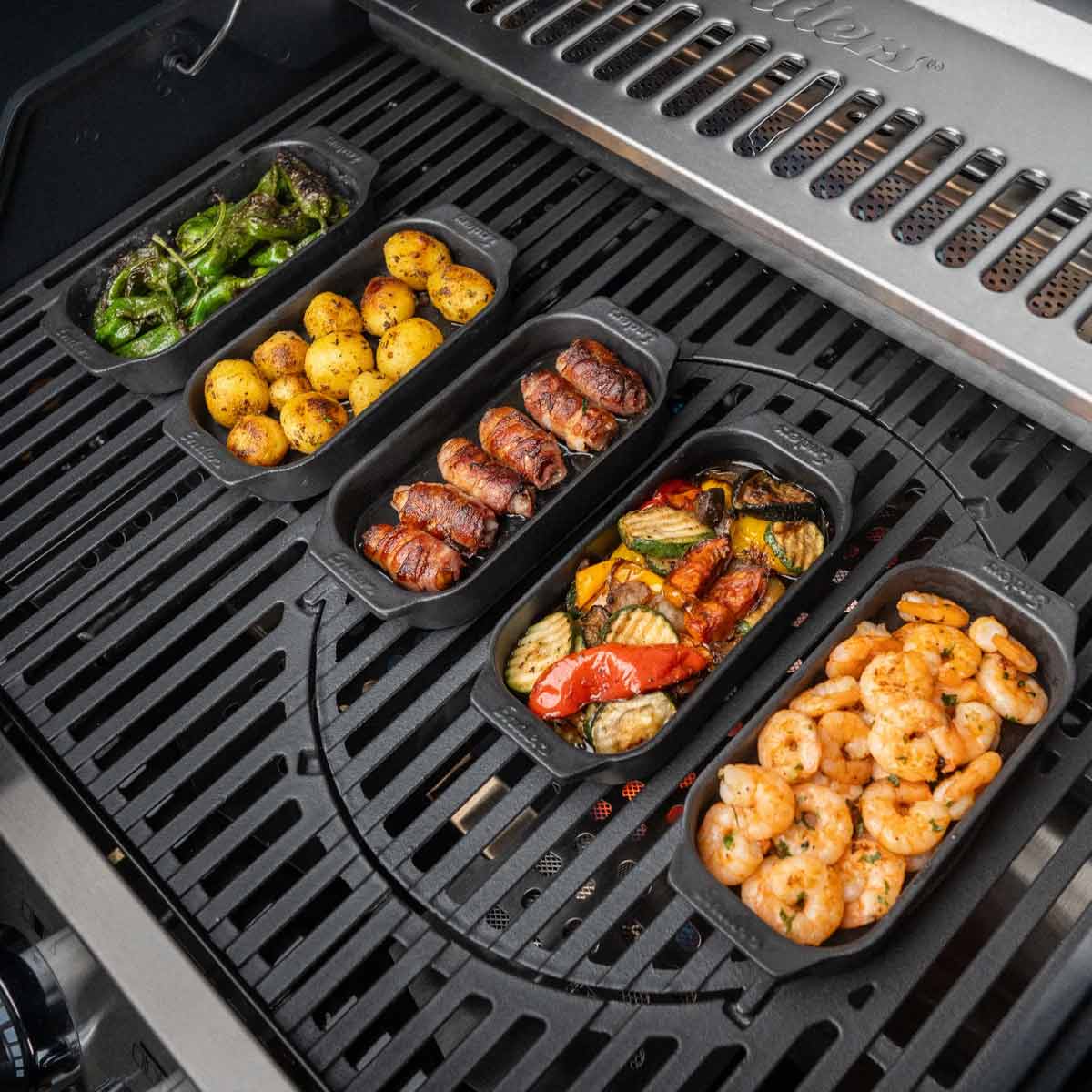 Die Gusseisenschalen (je 19 × 9 × 3,5 cm) sind so dimensioniert, dass sie perfekt auf dem Slider Grillrost unter den Cruster der Enders Uniq Pro Gasgrills passen. So können aber natürlich auch auf jedem Grillrost oder im Backofen positioniert werden.