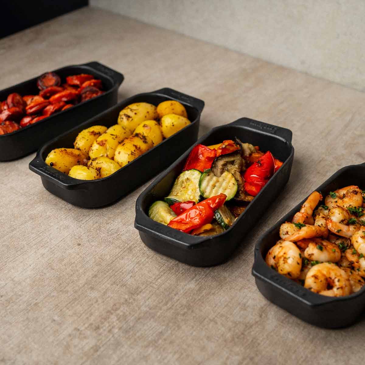 Mit den vier gusseisernen Grillschalen lassen sich kleine Portionen wie Gratins, Quiche oder Crème Brûlée spielend leicht zubereiten. Durch die hervorragende Hitzespeicherung bleibt alles auch nach dem Servieren lange warm.