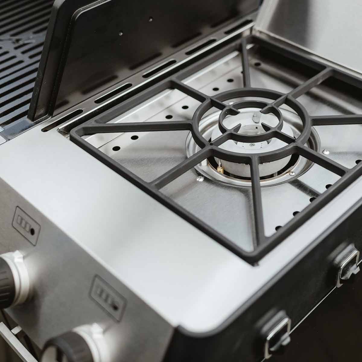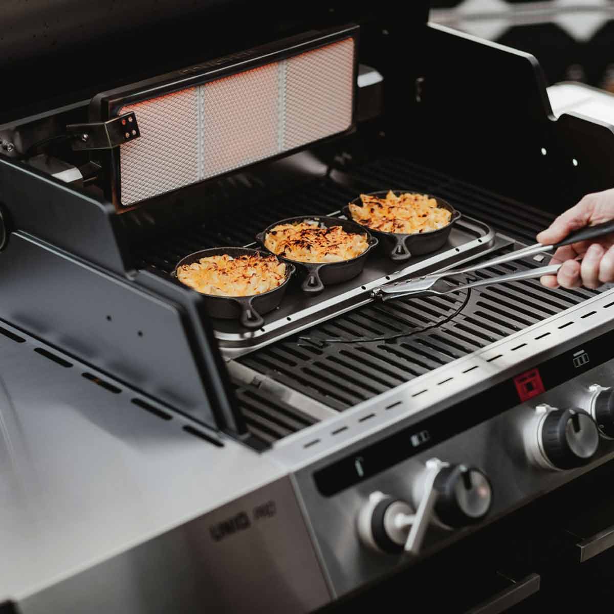 Die 800 °C Turbo Zone mit Infrarot-Mesh garantiert blitzschnelle Temperaturspitzen, während der Dual-Seitenkocher das parallele Zubereiten von Beilagen, Soßen oder Pfannengerichten bei niedrigen und hohen Temperaturen ermöglicht.