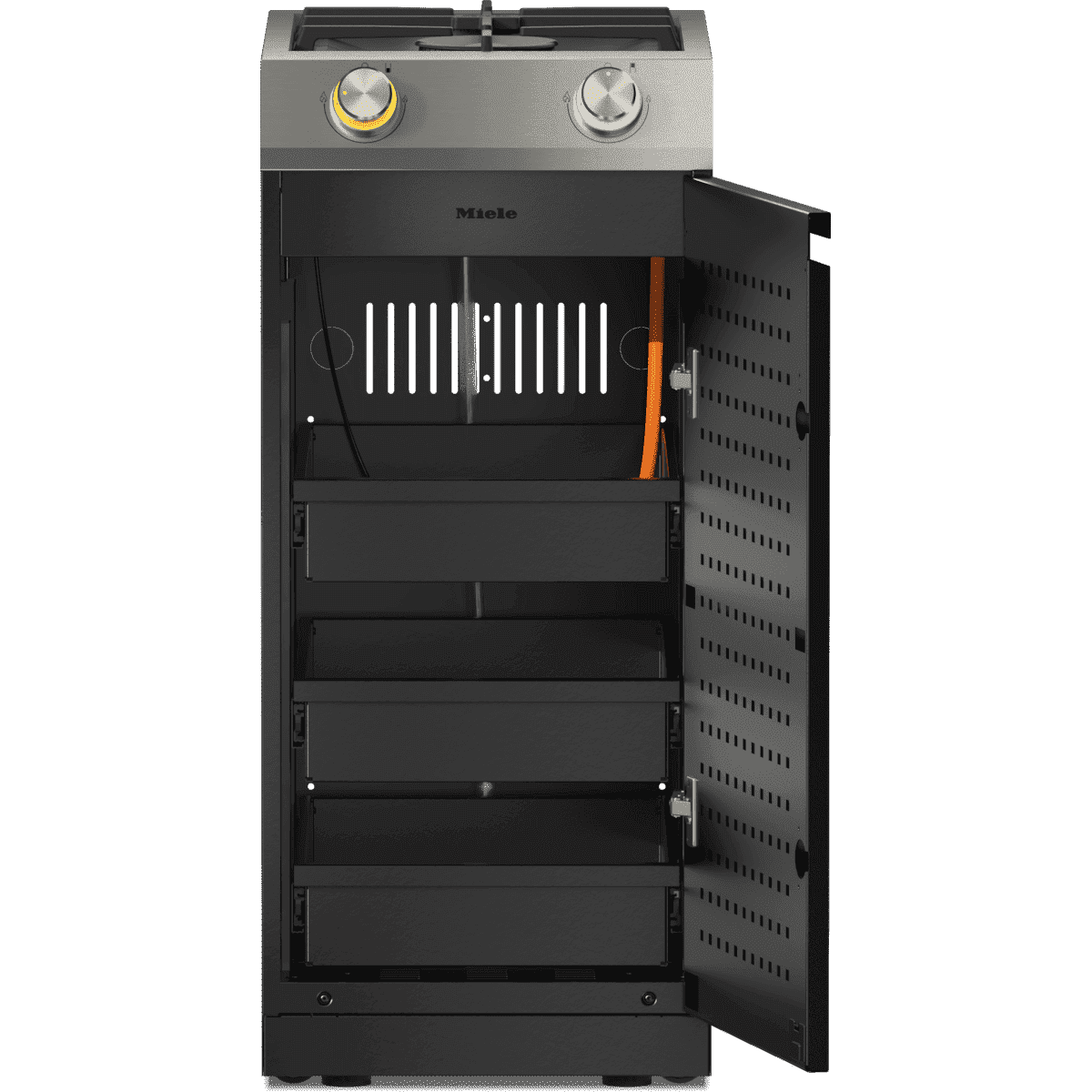 Das Miele Cook S 2PD ergänzt die Outdoor‑Küche um zwei präzise Brennerzonen – von niedrigen Temperaturen für Saucen bis zu hoher Leistung fürs Anbraten. Die Konstruktion leitet Feuchtigkeit ab; beleuchtete Knebel zeigen aktivierte Brenner. Edelstahl‑Muldenspiegel und emaillierte Gusstopfträger sind pflegeleicht und robust.