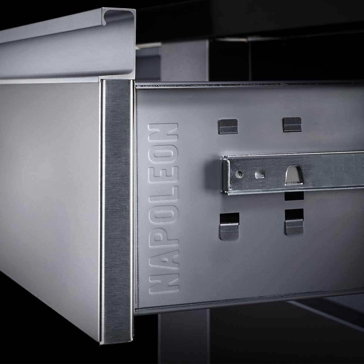 Alles untergebracht mit der Universallösung von Napoleon: Links besteht ausreichend Platz für z.B. die Gasflasche, rechts befinden sich drei Schubladen zum Verstauen von Grillutensilien.Die Schubladen und die Türe sind mit Softclose-Funktion ausgestattet.Technische Daten
