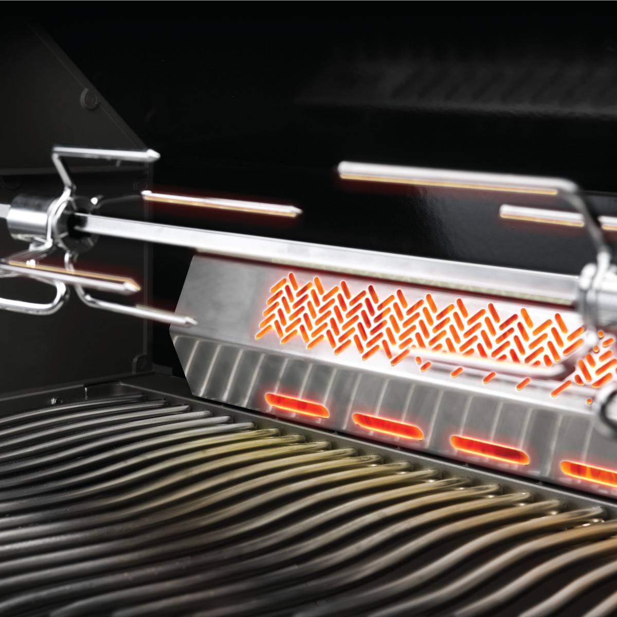 Die 9,5 mm dicken Edelstahlroste sorgen in Verbindung mit der großzügigen Grillfläche von 71 x 46 cm für das gefragte Napoleon-Branding.Edelstahl-Flammenschutzeinsätze