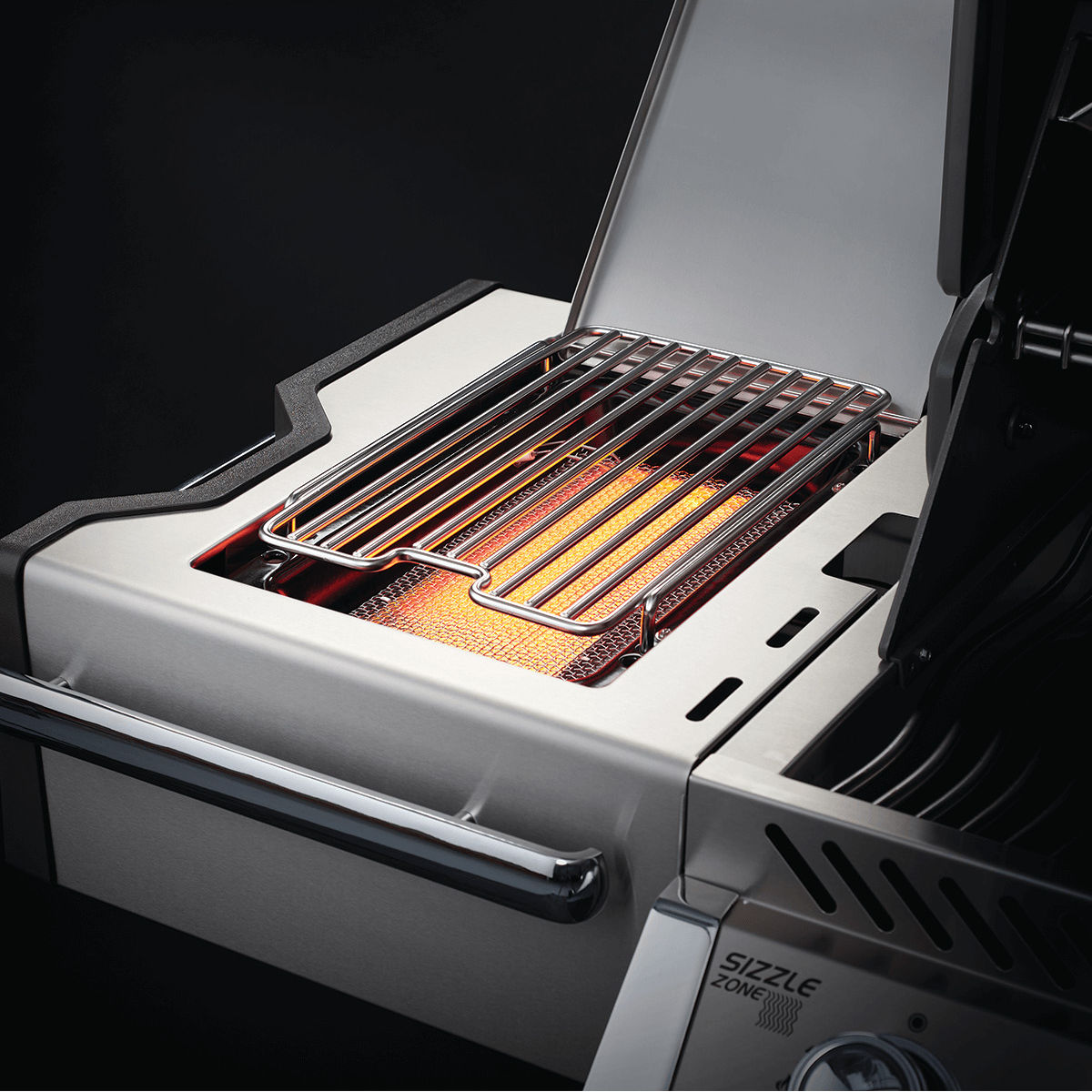 Dieser Extra heiße Brenner auf der linken Seite sorgt für erstklassige Röstaromen und ein unverwechselbares Branding. Die Sizzle Zone kann ebenfalls als Kochfeld benutzt werden. So gelingen perfekte Steaks und knackiges Gemüse dank höhenverstellbarem Edelstahl-Grillrost wie von selbst.Edelstahl-Infrarot-Heckbrenner