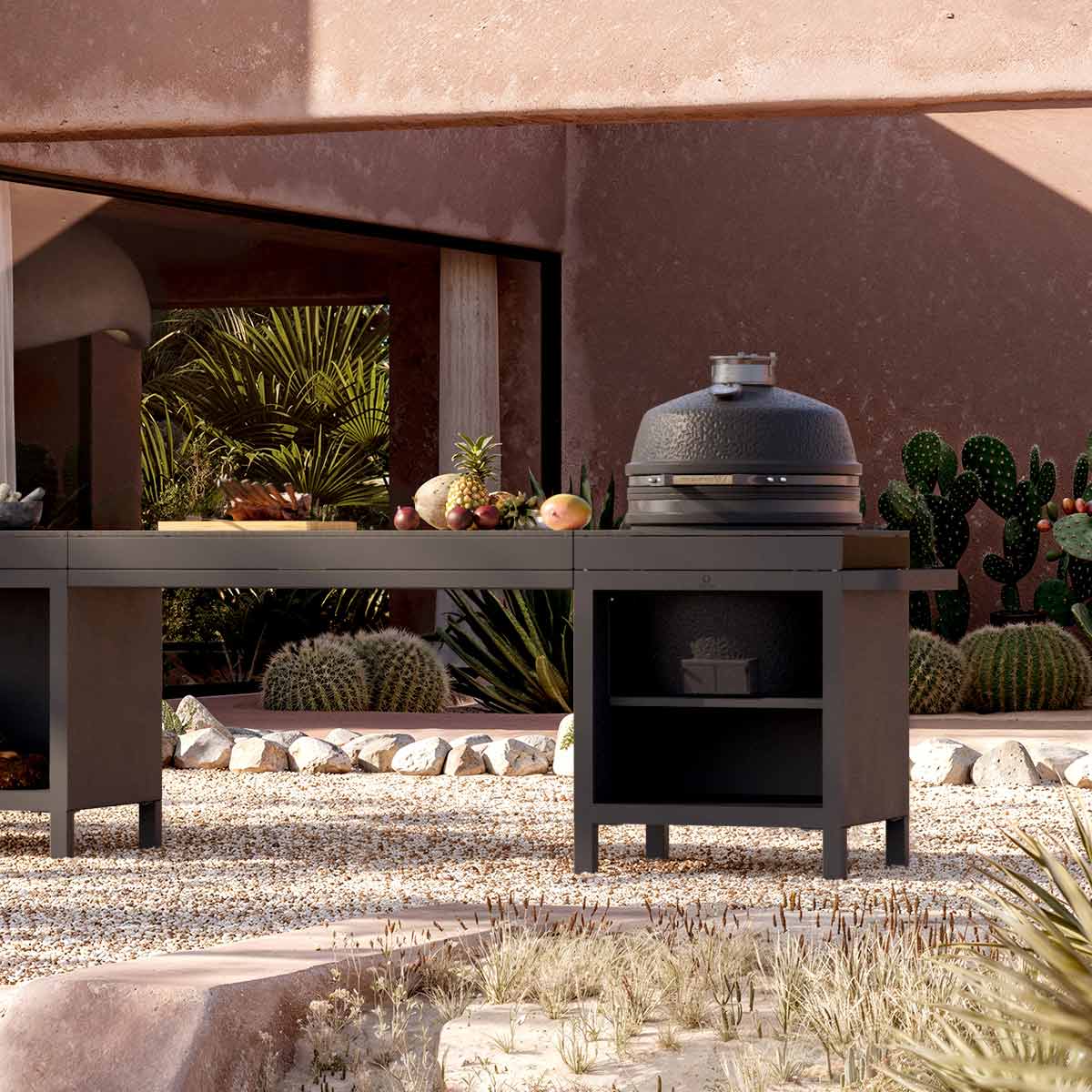 Die Kombination aus robustem Aluminium, Edelstahl und der hitzebeständigen Dekton-Arbeitsfläche sorgt für Langlebigkeit und unkomplizierte Pflege – perfekt für den ganzjährigen Einsatz im Freien.