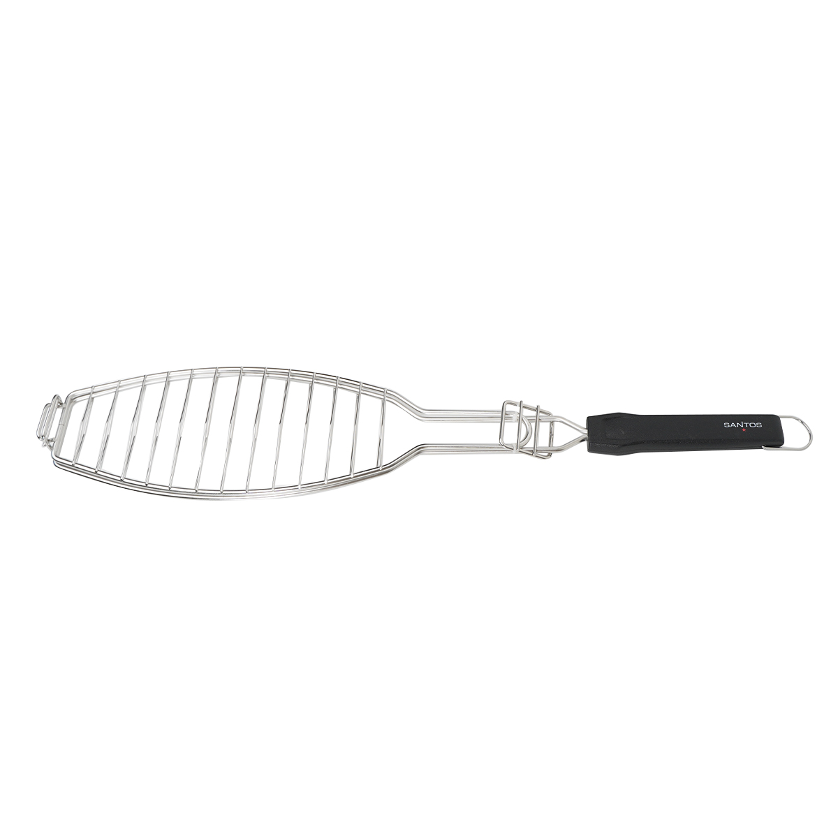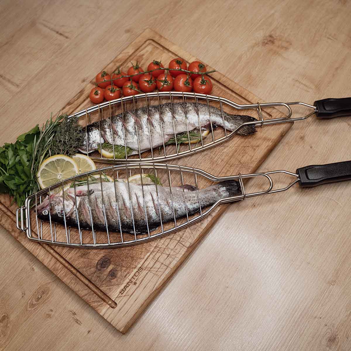 Das Problem kennt wohl jeder Fischliebhaber: Die frische Forelle liegt mit einer herrlich knusprigen Haut auf dem Grillrost, man hantiert zum Drehen mit dem Wender – und prompt bleibt die Haut am Rost haften, der Fisch zerbricht und fällt durch die Streben. Mit dem Fischbräter von SANTOS habt Ihr den passenden Grillkorb, der Euch eine entspannte Zubereitung von rundherum gleichmäßig gegarten ganzen Grillfischen bietet.Anwendung SANTOS Fischbräter