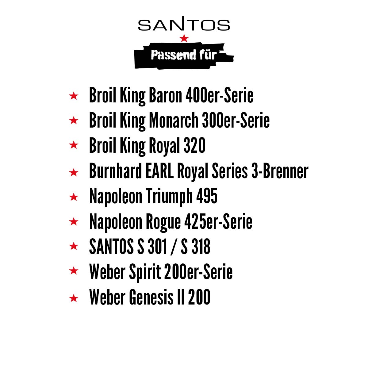 Mit unseren SANTOS Premium-Abdeckhauben schützt Ihr Euren Grill vor Witterungseinflüssen und Verschmutzung und verlängert deutlich seine Lebensdauer. Die SANTOS Grillabdeckung schützt zuverlässig vor Regen, Pollenflug und Vogeldreck. Klettbänder halten sie sicher an ihrem Platz, Belüftungsschlitze sorgen für Luftzufuhr bei längerem Gebrauch. So wird Euer Grill ideal verstaut, falls Ihr eine Grillpause einlegt, und ist beim nächsten BBQ sofort wieder einsatzbereit.Passend u.a. für folgende Gasgrills: