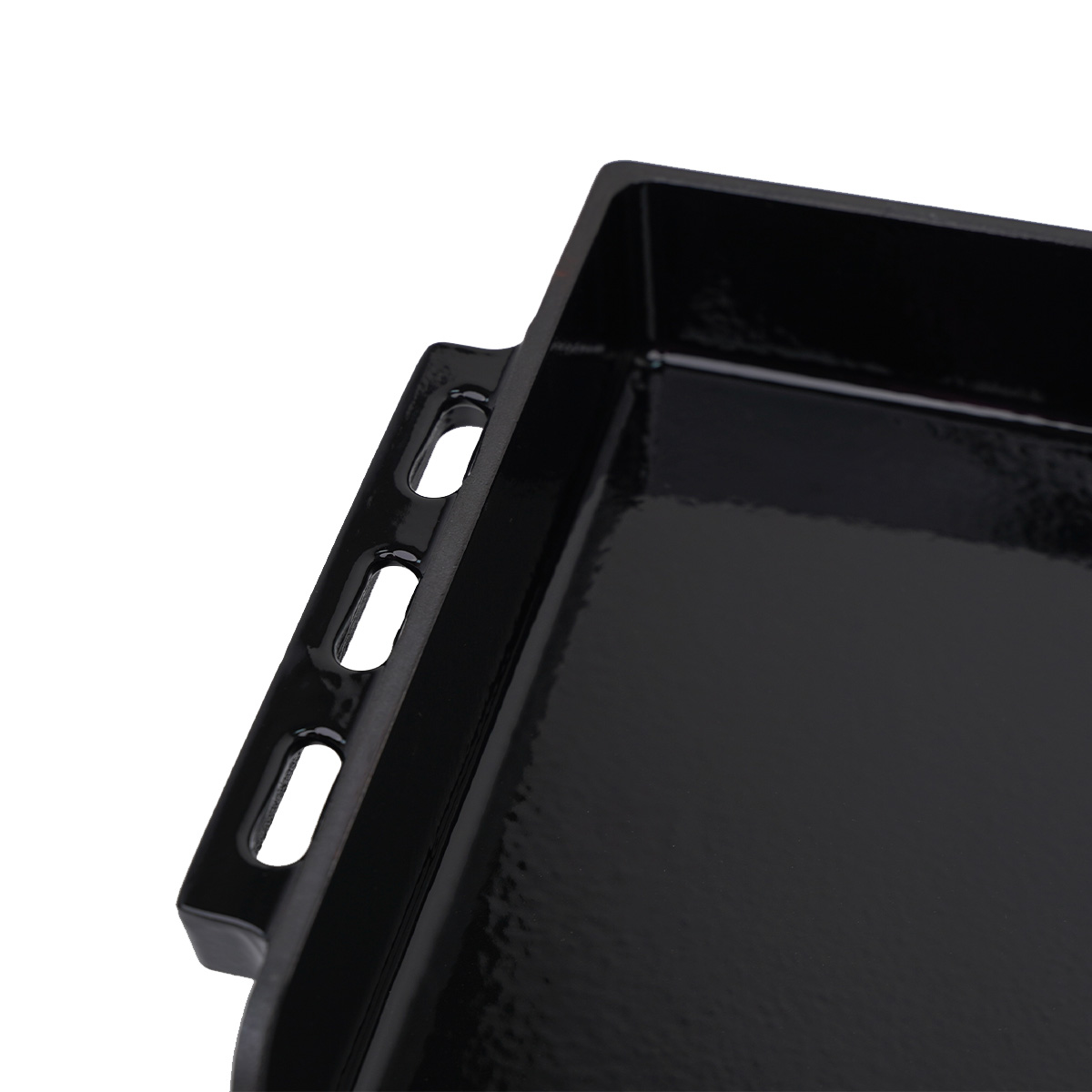 Die Plancha besteht aus hochwertigem Gusseisen, das für eine optimale Wärmeverteilung und -speicherung sorgt. Die Porzellanemaillierung reduziert das Anhaften von Grillgut und erleichtert die Reinigung. Die leicht geneigte Oberfläche ermöglicht das Abfließen überschüssiger Flüssigkeiten, während der umlaufende Rand Spritzer verhindert.