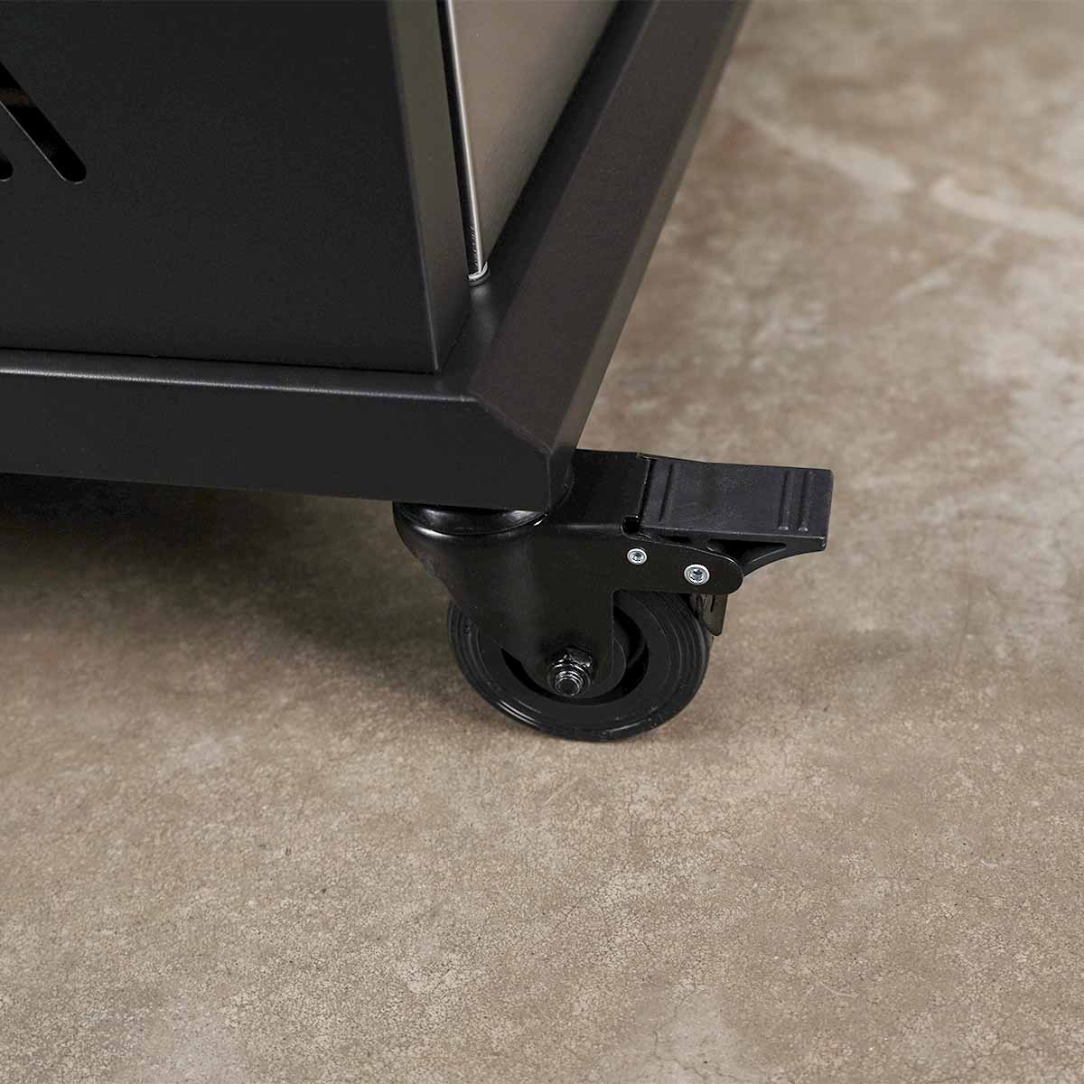 Mit dem bis ins Detail durchdachten Unterschrank haben Grill-Chaos und Unordnung keine Chance mehr: An den Haken der beiden Seitenablagen hängt Ihr von Grillzange bis Flaschenöffner alles, was stets schnell zur Hand sein muss. Zusätzlich lässt sich ein großer Aufbewahrungskorb an der rechten Außenseite einhängen. Hier könnt Ihr Marinaden, Speiseöl, Gewürze und Bierflasche griffbereit deponieren. Das Innere des Unterschranks kommt genauso aufgeräumt daher und bietet mit den beiden ausziehbaren Edelstahl Gitterkörben den perfekten Platz, um weiteres Grillzubehör bequem zu verstauen. Für eine sichere Aufbewahrung der Gasflasche sorgt die stabile Flaschenhalterung aus Edelstahl. Durch den quadratischen Grundriss lassen sich handelsübliche Gasflaschen bis 11 kg ganz bequem einsetzen. So ist die Gasflasche bestens geschützt, transportabel und zudem gut versteckt. Harmonisch abgerundet wird der S-418 Pro durch sein elegantes Design in geradliniger Optik. Die Außenflächen aus coolem Edelstahl kombiniert mit den vertikalen Griffmulden der Türen verleihen dem Grill einen ausgesprochen edlen und modernen Look. Zu guter Letzt liefern die hochwertigen Lenkrollen zusätzlichen Komfort. Die großen Gummirollen sind sehr leichtgängig, wendig und geräuscharm und machen Eure Grillstation auch auf unebenem Gelände mobil. Mit der PVC-Ummantelung sind sie gleichzeitig robust und strapazierfähig und bieten ein Höchstmaß an Sicherheit. Alle vier Rollen sind mit einer Feststellbremse ausgestattet, so dass Ihr die Position Eures S-418 Pro sicher fixieren könnt.
