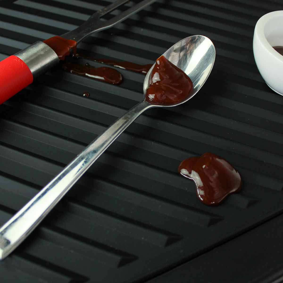 Die großzügige Größe von 44 x 30 cm macht diese Silikonmatte perfekt für jede Grillstation. Ihr rutschfestes und langlebiges Material bietet eine zuverlässige Basis für dein Grillzubehör und nimmt weder Flecken noch Gerüche an. Dank ihrer Flexibilität kommt die Ablage problemlos mit Lebensmitteln in Berührung, während die Riffelung dafür sorgt, dass das Grillbesteck nicht im Sud liegt.Multifunktionale Silikon-Besteckablage