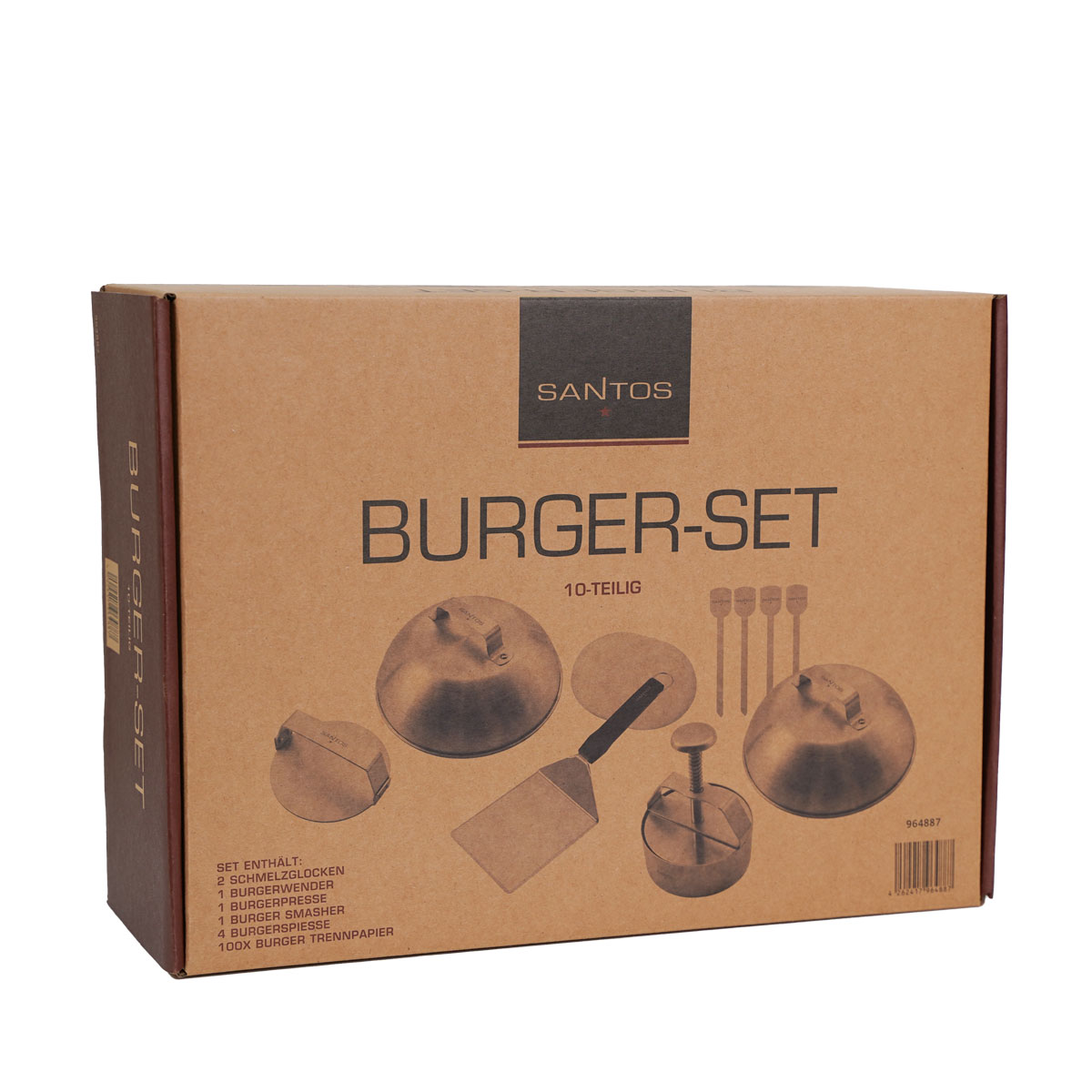 Cheeseburger, Smashed Burger, Seafood Burger, Veggie-Burger: Die schöne Welt der gefüllten Brötchen kennt kulinarisch keine Limits. Mit dem 10-teiligen Set von SANTOS geben wir Euch das all inclusive-Paket an die Hand, um mit perfekten Burgern zu beeindrucken. Das Set beinhaltet alle Tools, die Ihr für jeden Schritt bis zum genüsslichen Verputzen der Burger benötigt. Vorbereitung, Grillen, Servieren – das hochwertige Zubehör aus lebensmittelechtem Edelstahl nimmt Euch zwar nicht die ganze Arbeit ab, unterstützt Euch aber wesentlich auf dem Weg zum umjubelten Burger-Meister.SANTOS Edelstahl Burger Presse