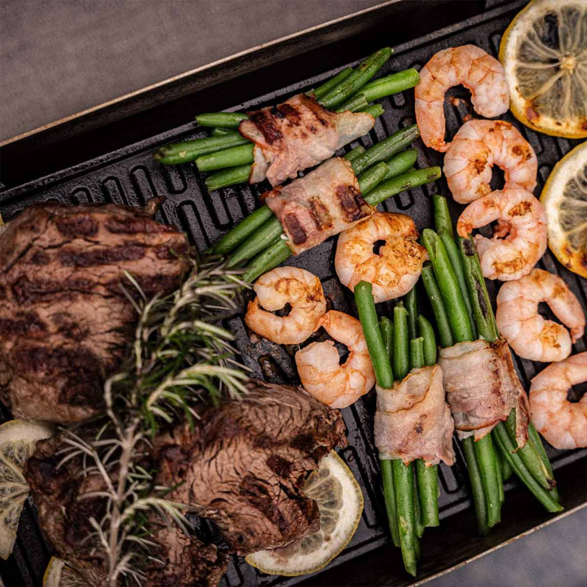 Die Skotti Kast Grillplatte ist die perfekte Ergänzung für Euren Skotti Grill: Einfach auflegen, aufheizen und loslegen. Die Platte wird anstelle des Standard-Grillrosts in den Skotti-Gasgrill eingesetzt und ist damit direkt einsatzbereit. Ob saftige Steaks, zarter Fisch oder knackiges Gemüse – die massive Gusseisen-Plancha sorgt dafür, dass Ihr auch unterwegs auf perfekte Grillstreifen, einen intensiven Geschmack und vielfältige Grillmöglichkeiten nicht verzichten müsst. Gusseisen mit optimaler Hitzespeicherung: Für effizientes und gleichmäßiges Grillen mit saftigen Ergebnissen. Zwei Seiten, doppelte Möglichkeiten: Gerilltes Muster für perfekte Grillstreifen auf Steak, Filet und Co oder glatte Fläche für Pfannkuchen, Meeresfrüchte und Spiegeleier. Vielseitig einsetzbar: Ideal für Fleisch, Fisch, Gemüse, Reibekuchen, Eiergerichte und mehr. Robust und langlebig: Gusseisen wird mit jedem Einsatz besser und hält ein Leben lang. Bitte beachtet, dass Ihr Gusseisen nur mit Wasser reinigt und anschließend mit etwas Speiseöl behandelt, um Rostbildung bei der Lagerung zu verhindern. So verbessern sich die Antihafteigenschaften mit jeder Nutzung. Mit der Skotti Kast Plancha bringt Ihr Abwechslung und Profi-Qualität auf Euren Skotti Grill – Skotti-Style eben!